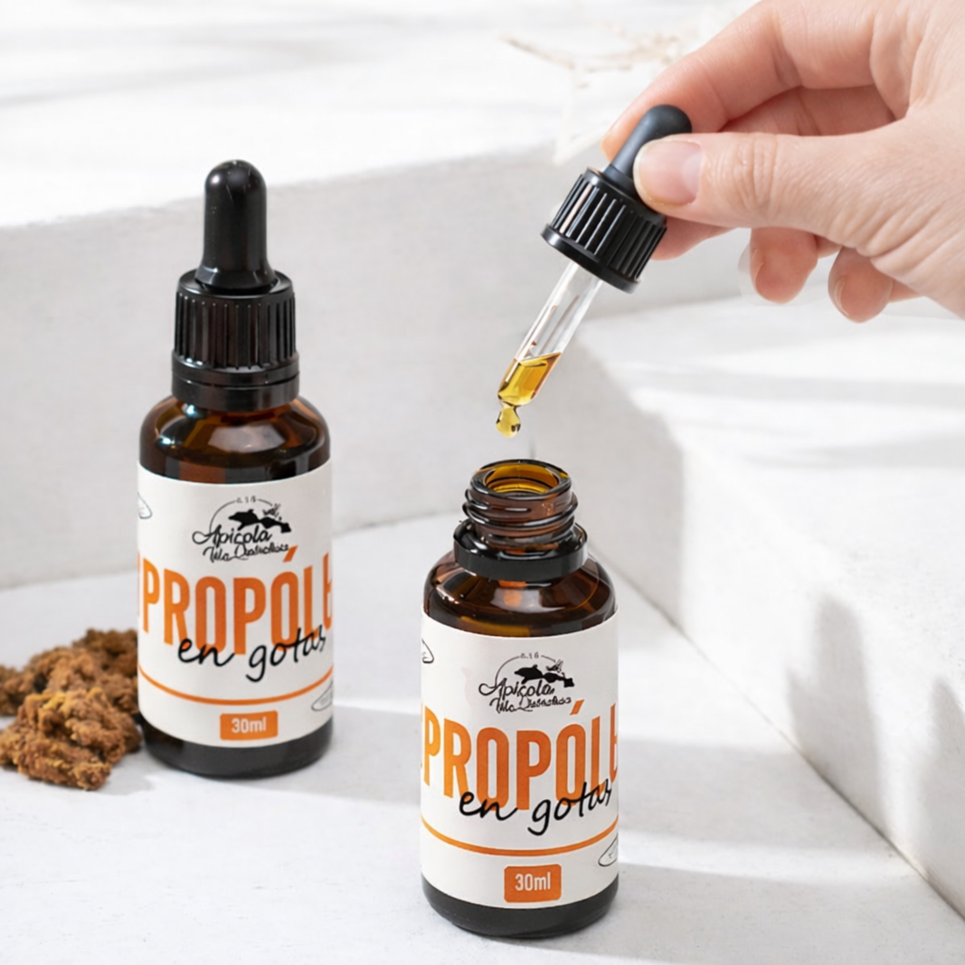 Nuestra Tintura Madre de Propóleo al 30 % es un extracto concentrado elaborado a partir de propóleo natural, sustancia que las abejas obtienen de resinas de árboles y plantas del entorno.